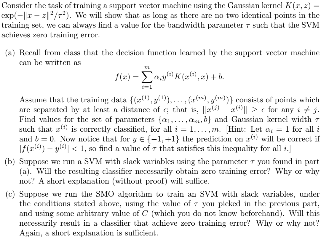 (b)可以正确分类。根据(a)的结论,无论样本点在低维情况下(即不用核技巧)可不可separable,我们都可以用高斯核函数把它们映射到无限维空间中进行separable(惩罚项还是要一直保证),保证所有样本点正确分类。这里,带松弛变量的SVM(即用来解决低维情况下non-separable的改进版SVM)是原有SVM在一般情况下的推广,所以在同样\tau的条件下,既然SVM可以正确分类所有样本点,那么作为更一般的带松弛变量的SVM肯定也可以正确分类。
