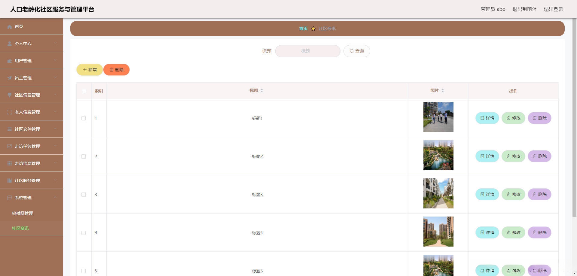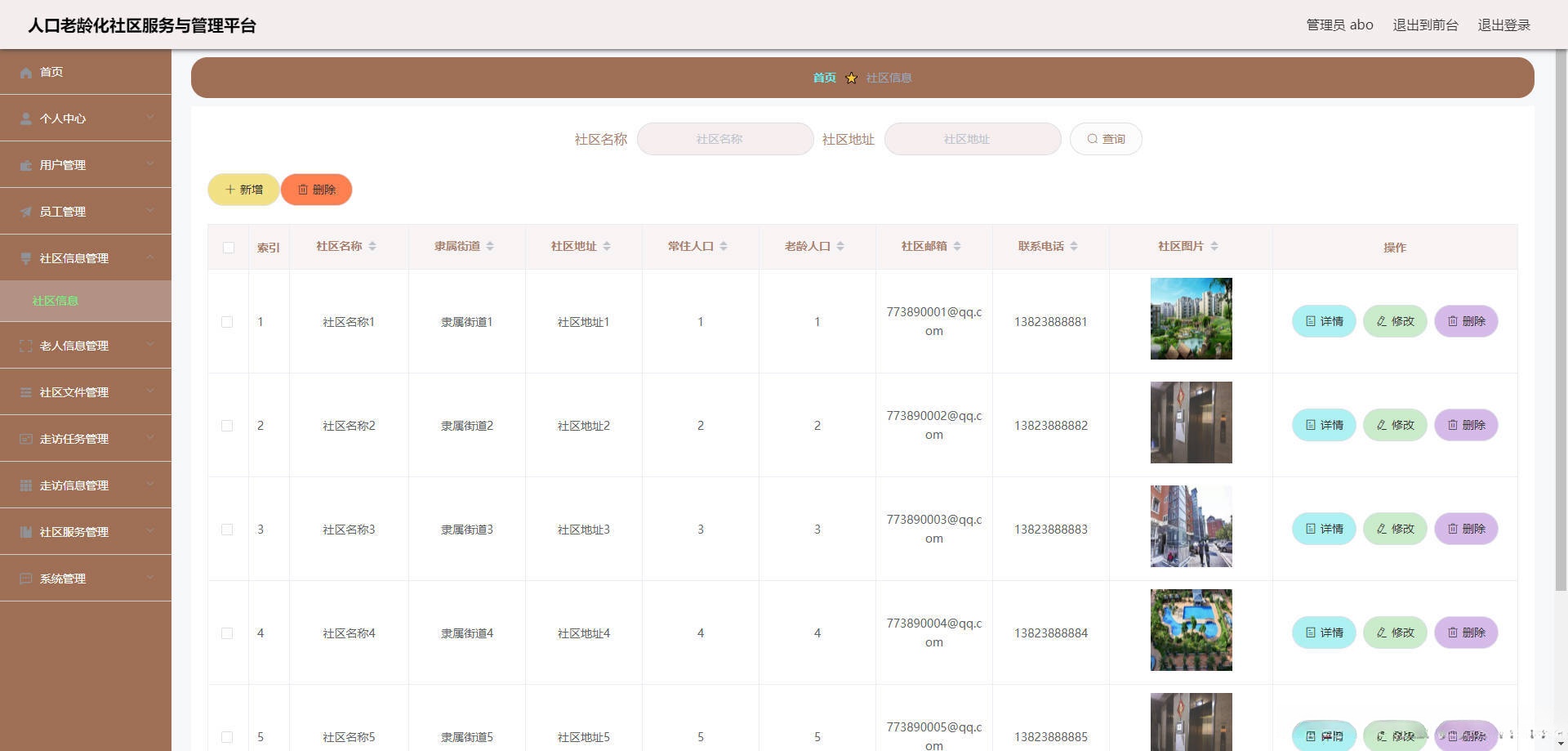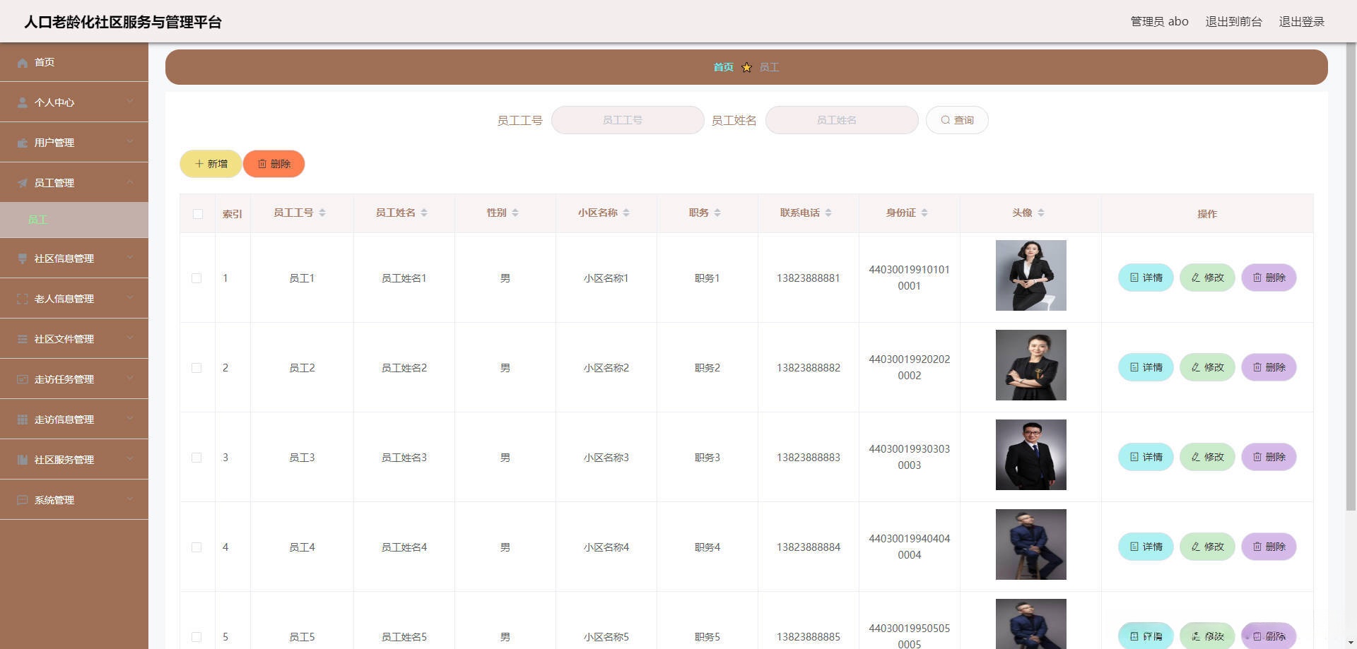 本人口老龄化社区服务与管理平台有管理员,用户,员工。管理员功能有个人中心,用户管理,员工管理,社区信息管理,老人信息管理,社区文件管理,走访任务管理,走访信息管理,社区服务管理,系统管理等。