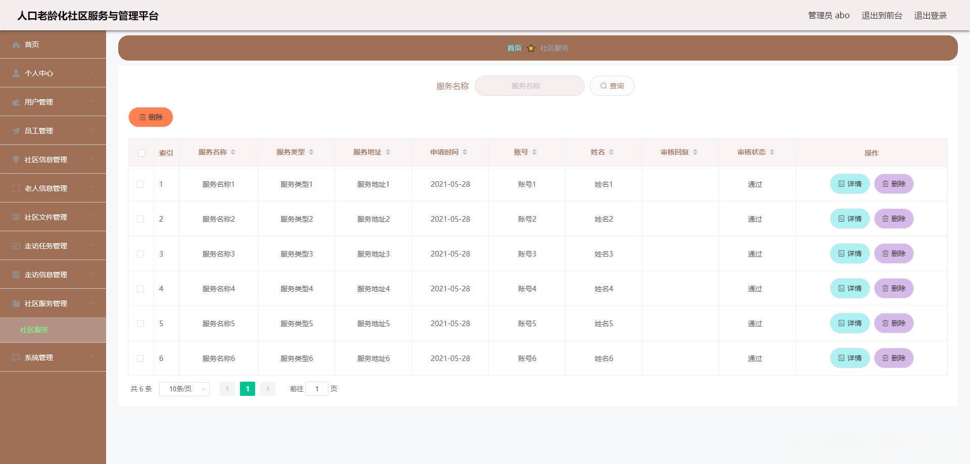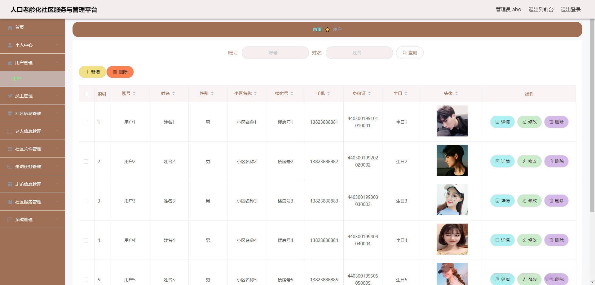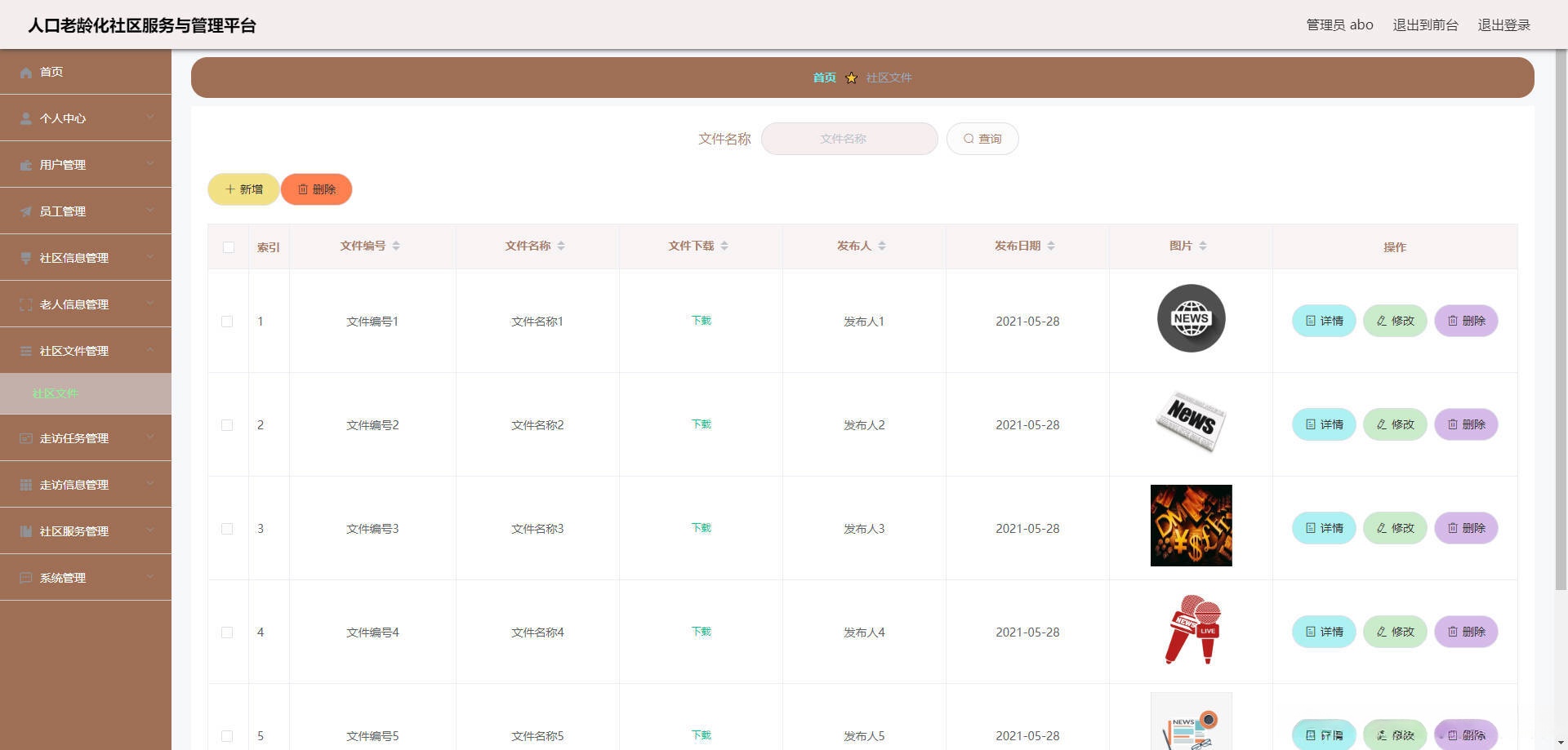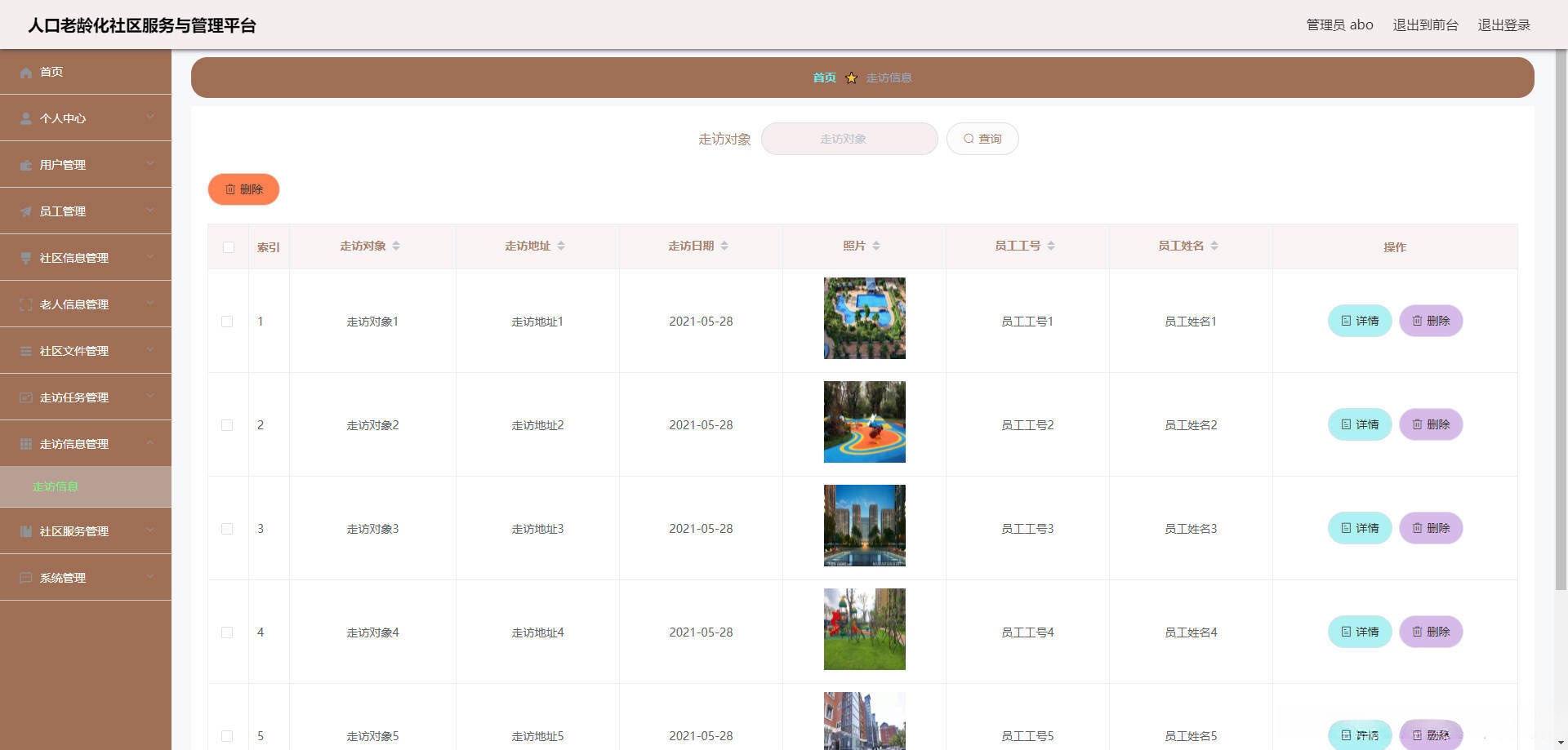 本人口老龄化社区服务与管理平台有管理员,用户,员工。管理员功能有个人中心,用户管理,员工管理,社区信息管理,老人信息管理,社区文件管理,走访任务管理,走访信息管理,社区服务管理,系统管理等。