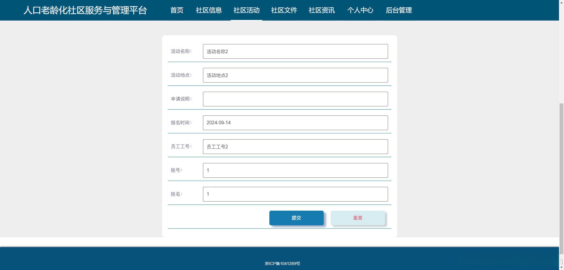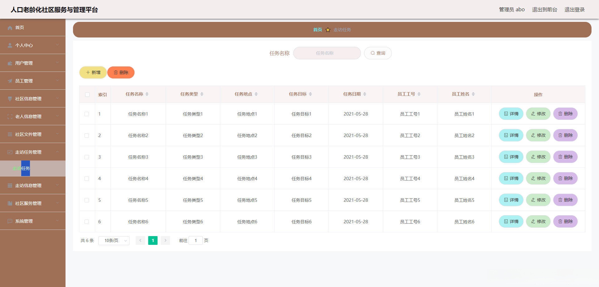 员工功能有个人中心,社区活动管理,活动报名管理,老人信息管理,走访任务管理,走访信息管理,社区服务管理。