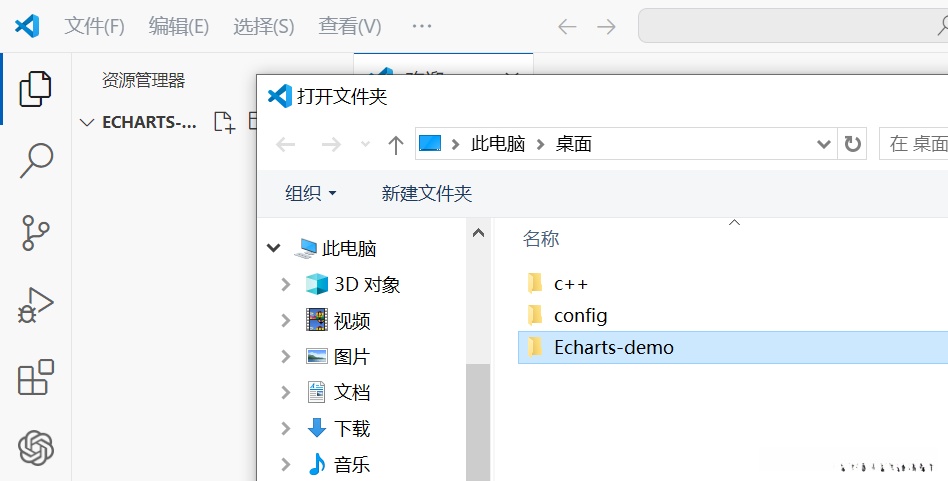 桌面新建文件夹,命名为Echarts-demo,使用VScode工具打开文件夹。