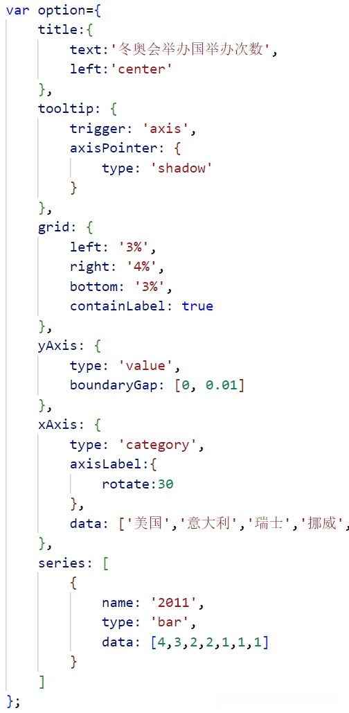 使用实例的方法setOption来提供一个配置与数据结合的对象,并用于设置图表样式及展示内容。代码如下: