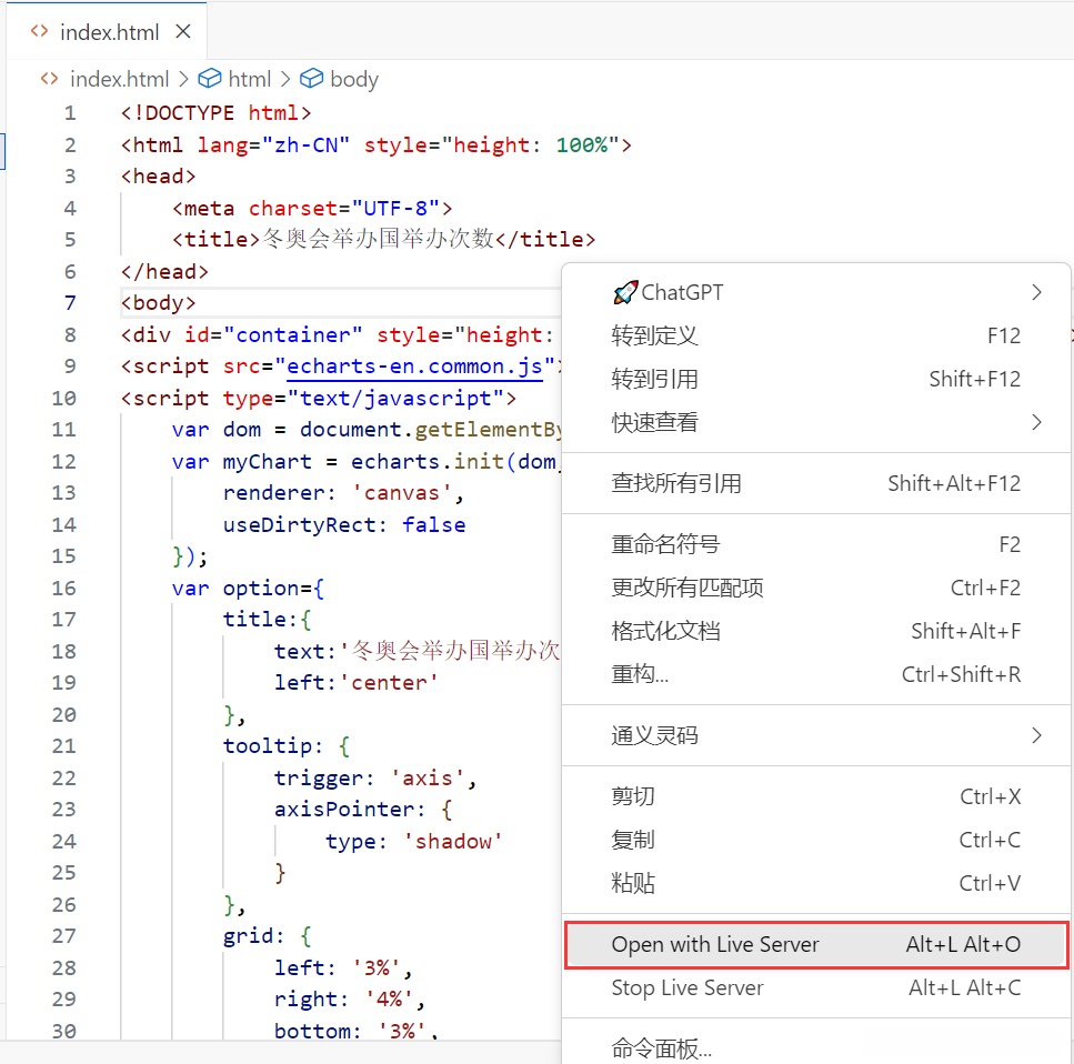 在 HTML 文件中引入 echarts-en.common.js文件,代码如下: