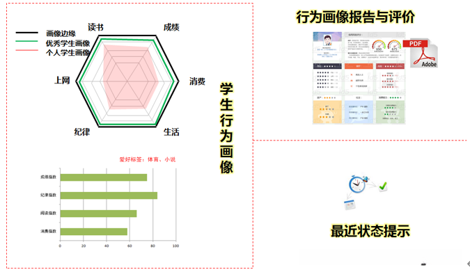 通过对学生课程、生活等数据挖掘分析,我们可以得知学生成绩、消费、借阅各个方面的得分。我们也借鉴了QQ形象标签这功能,为学生贴上学渣、学霸、上网达人等标签。
