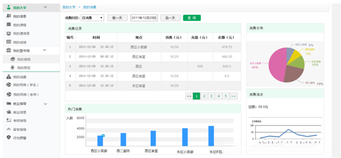 学生可以详细知道自己的消费金额、消费内容、消费时间、个人消费比例和排序等。