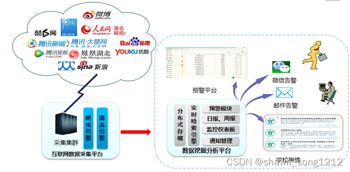 通过爬虫软件和其它的采集系统,对校内的论坛、校外的知名网站进行关键字信息收集与舆论分析,可按照关键词的紧急程度划分紧急、重要、一般三个等级,根据学校的需求按照时间影响程度不同采取不同的推送措施。
