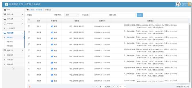 本平台可以采集到学生网络、消费、图书借阅等信息,通过对这些数据关联分析,我们可以实现学生的失联预警,避免意外发生;