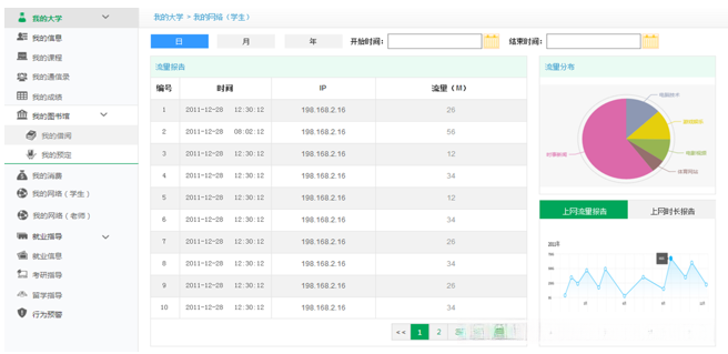 学校最大的用户群体是学生,在微信层面开发了 “我的大学”这个功能模块,为每个学生提供了一个平台,从成绩、图书、消费、网络、就业多维度展现学生的大学情况,可以让学生、老师和家长全面角度审视和了解自己。