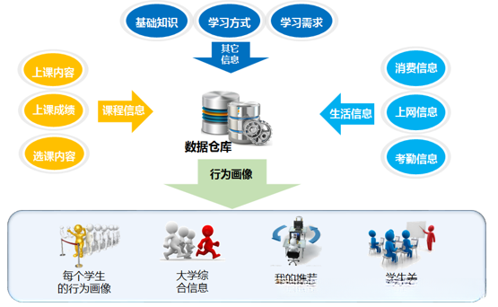 为整个学生大学四年的所有学习、生活、上网、消费等所有数据,通过大学生涯的跟踪和分析,为对每个学生勾画个人形象。