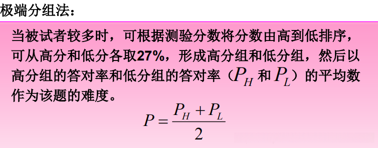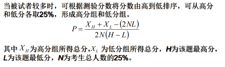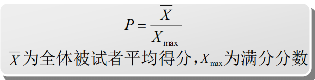 难度代表测验项目的难易水平,在测量应试者回答一个题目时所遇到的障碍性时使用的指标被称为题目的难度系数,并用P来表示。