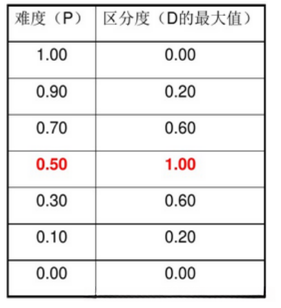 低分组通过率低; D 为负时,试题消极区分,即高分组通过率低,