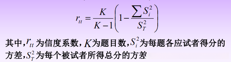 **论文测验的评估缺乏严格的规范性标准,在同一道题上不同考生的回答及其评价结果均存在差异性问题,在此情况下我们不能沿用前述方法进行评估而应当采用克龙巴赫(Cronbach, 1951)所提出的信度系数计算公式来进行测量可靠性分析: