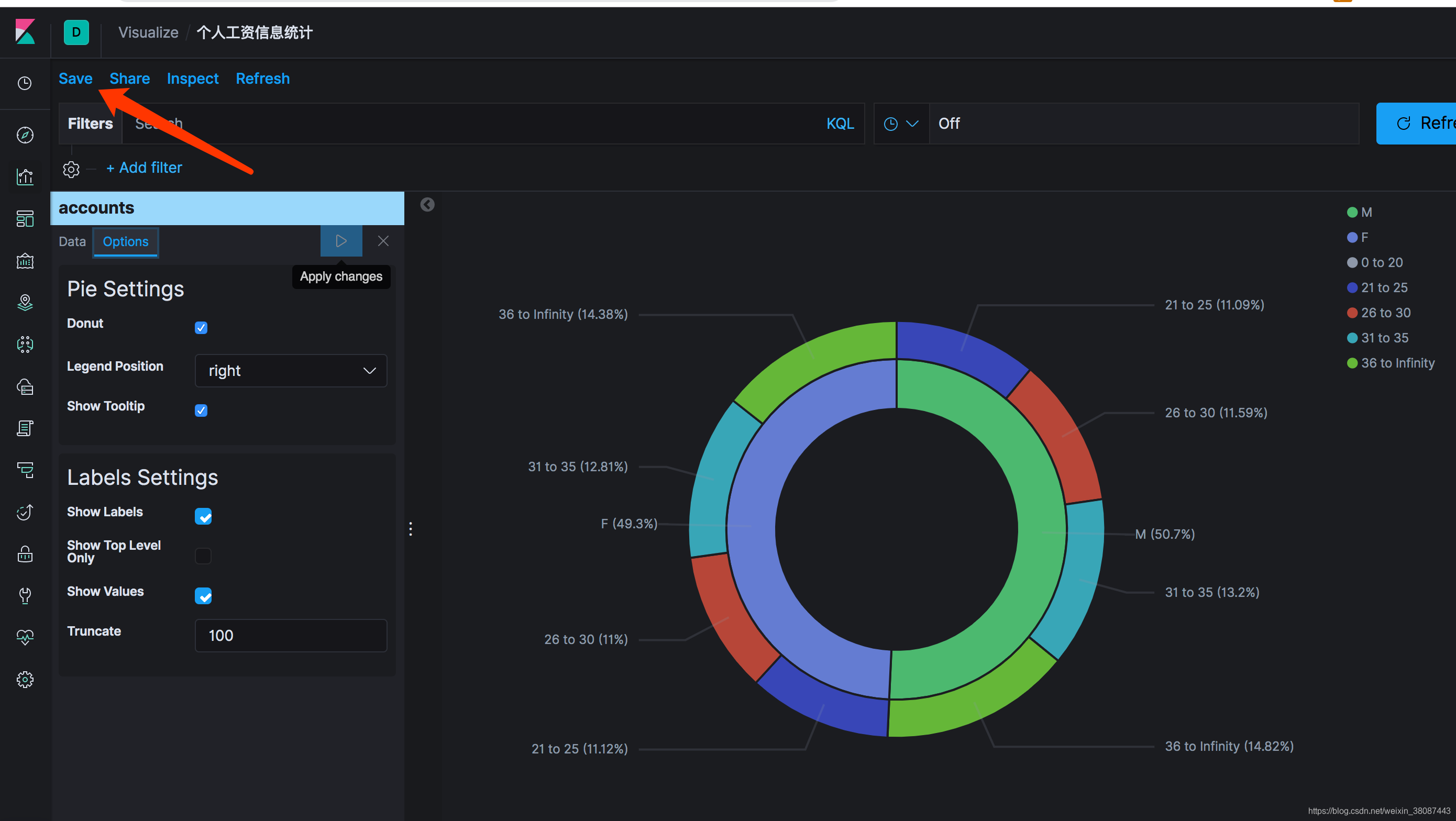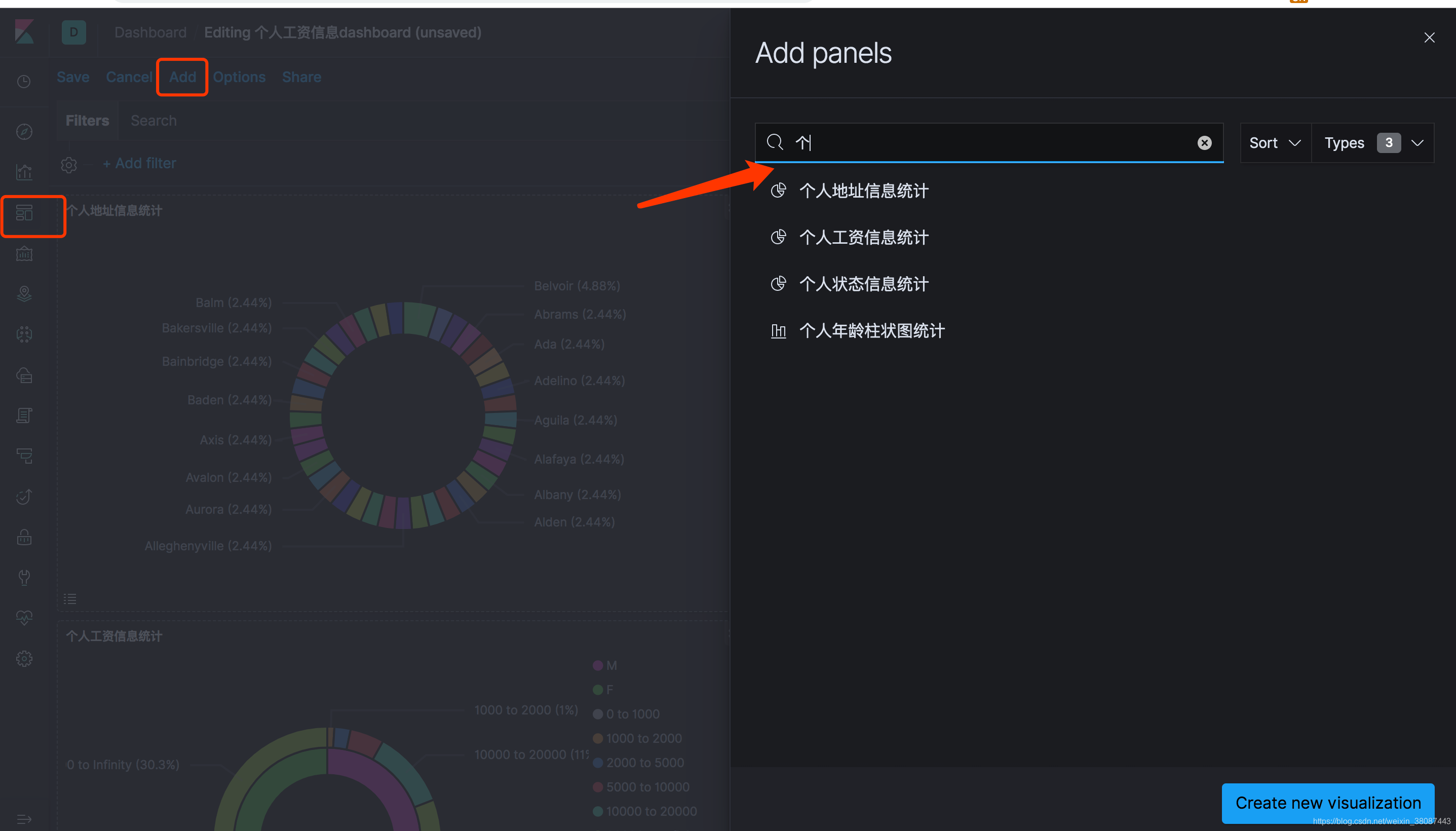 进入DashBoard 页面配置,新增panels,找到刚才保存的Visualize名字,搜索关键字,确认后,即可出现在一个页面,此时记得保存DashBoard 并起一个好听的名字。