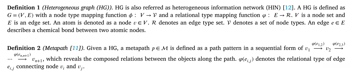 然而,大多数现有的基于gnn的方法[1]只考虑同质图中相邻原子的相互作用,其中节点类型表示和边缘类型表示由线性层投影,并且仅由来自最近节点的消息交互更新,忽略了来自不同化学官能团的复杂异构原子之间的高阶相互作用。因此,一个问题是如何为这种相互作用建模。我们的答案是异构信息网络上的元路径[11]。与同质图相比,异构信息网络(HINs)[12]由于具有学习多种节点类型和关系类型的灵活能力,因此更适合于分子建模。