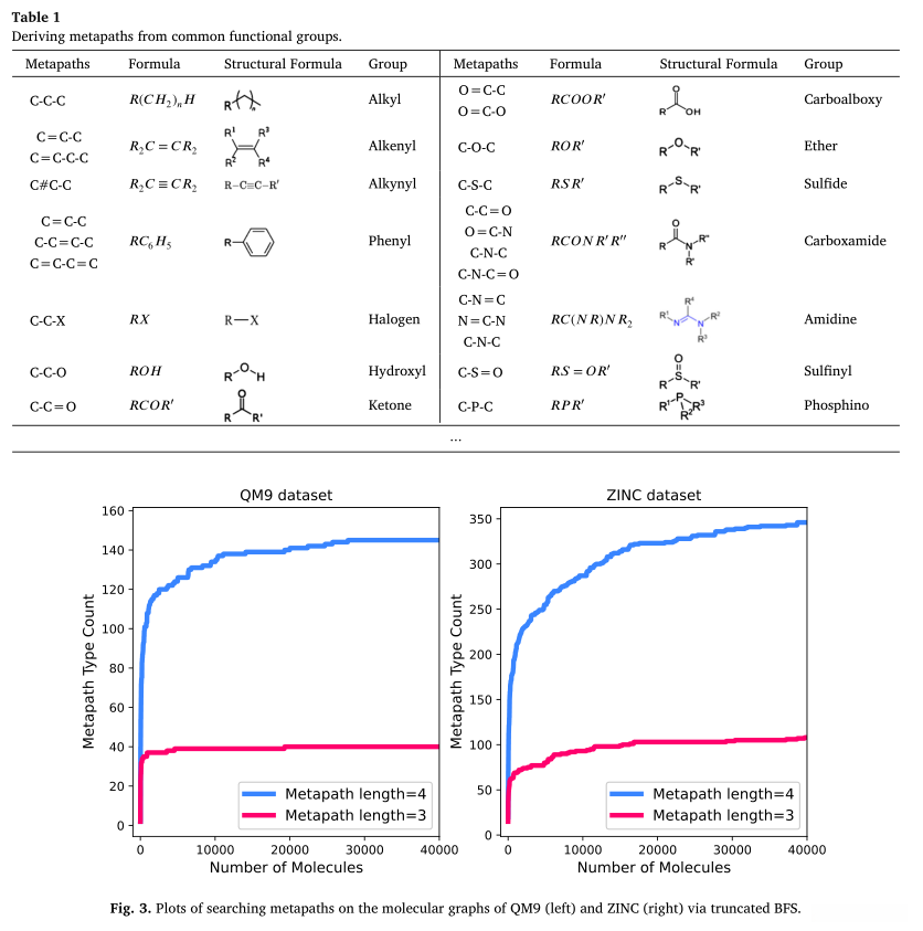 化学官能团是构成有机分子的基本基团,通常主导着分子性质[45]。我们建议通过构建基于元路径的连接来利用这些化学结构。与之前的工作[15,46]类似,我们将一些元路径定义为模板语料库。为了定义元路径,我们在分子数据集QM9和ZINC中使用截断宽度优先路径搜索(截断宽度优先路径搜索)算法来收集原始元路径。如表1所示,我们可以从由可计数的官能团组成的分子中得到有意义的、多样的元路径。有趣的是,我们发现分子数的增加并不会导致元路径的显著增加,如图3所示。这意味着我们可以访问的元路径数量很少,确保元路径数量不会爆炸。因此,选择过程不花费太多的专家劳动力。所选的元路径语料库见表7。然后,我们对每个图中的每个预定义元路径模板执行算法1中提出的图遍历算法,以获得所有元路径实例。每个实例是由图的节点和关系组成的序列,与相应的元路径模板匹配。对于某个元路径模板p∈M,在一个图中可能存在多个对应的实例。为了使同一元路径实例中的节点紧密关联,我们通过连接每个实例中的源节点和目标节点来构造元路径连接边。如图2所示,基于元路径的边(虚线边)p可以被视为连接相邻节点vi和vj的子图级别的附加边。