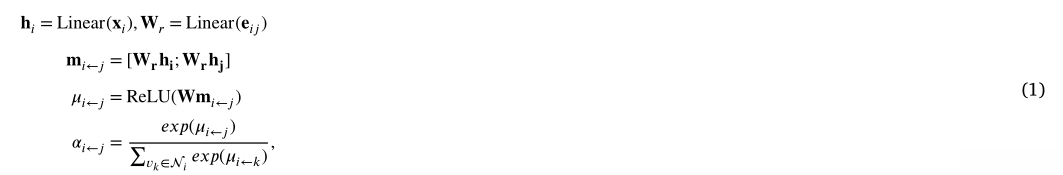 其中퐱푖为原始离散特征。根据前面的工作[36],퐡푖由一个线性层初始化,该线性层将离散特征向量投影为连续向量。퐞푖푗为原始边缘特征,并将其变换重塑为퐖푟。푟∈푏표푛푑∪,푣푗∈푖,和푖表示的邻近节点푣푖。퐖∈∈퐹×푑是一个权重矩阵,它将连接的隐藏嵌入投影到一个重要分数휇푖←푗中。;表示连接操作。尽管分子图是无向的,但我们认为消息是从邻近节点传播到中心节点的。