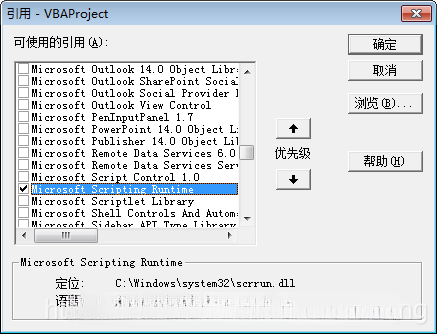 在使用FSO时,请参考下文中的示意图:应用FSO时,在VBA工程中需要导入Microsoft Scripting Runtime库。