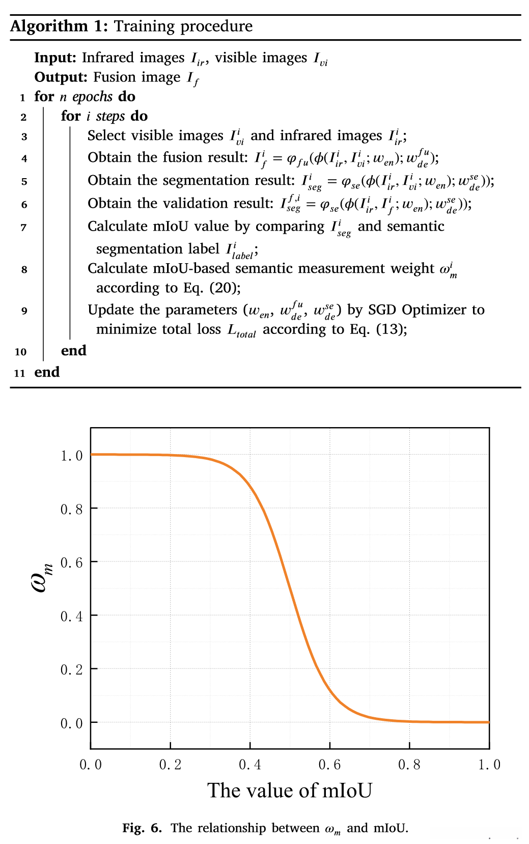 这个权重取决于分割网络在每个训练批次中计算得出的具体数值——即mIoU值。当该网络在语义理解方面表现较弱(对应的mIoU值较低)时,适当提高了对语义损失项的关注程度;随着训练进程推进,在该网络逐渐增强其语义理解能力的过程中(对应的mIoU值上升),适当降低了对语义损失项的关注程度,并相应地提高了对验证域相关损失项的关注程度,并促使模型更加注重像素级融合结果的质量。