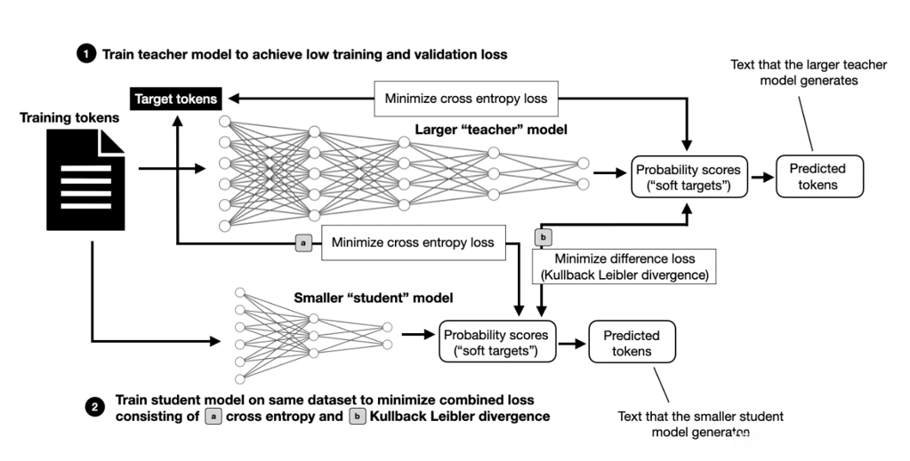 如上所示,知识蒸馏仍然涉及在原始数据集上训练。然而,除了数据集中的训练标记之外,被训练的模型(称为学生)还从更大的(教师)模型接收信息,这比没有知识蒸馏的训练提供了更丰富的信号。缺点是你必须:1)首先训练更大的教师模型,2)使用更大的教师模型计算所有训练标记的预测。这些预测可以提前计算(需要大量存储空间)或在训练期间计算(可能会减慢训练过程)。