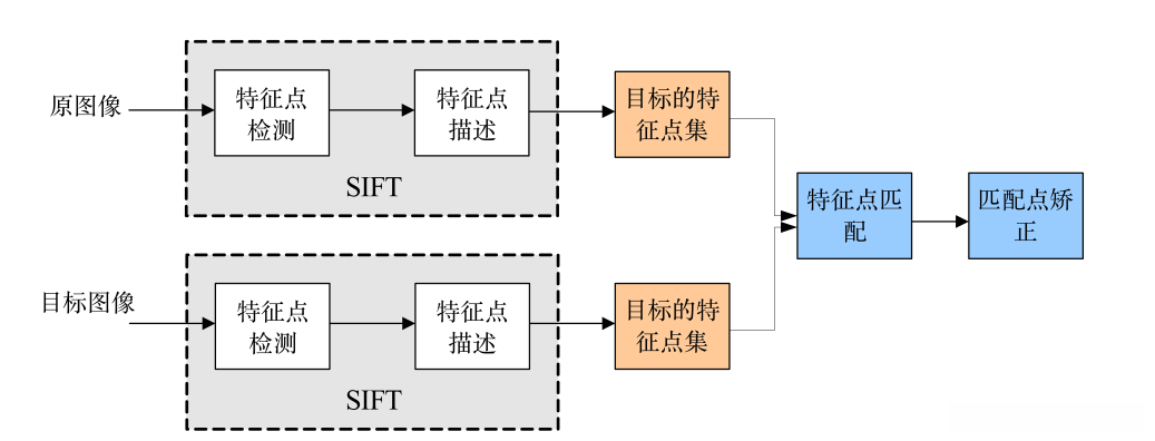 该算法通过三阶段流程实现特征匹配。首先提取关键点。接着为每个关键点附加详细信息(局部特性和方向),这些信息统称为描述符。最后通过逐一比对所有特征点及其对应的向量信息来确定多组相互匹配的特征对,并由此建立景物间的对应关系。