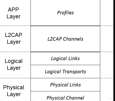 蓝牙协议分为四个层次:物理层(Physical Layer)、逻辑层(Logical Layer)、L2CAP Layer和应用层(APP Layer)。
