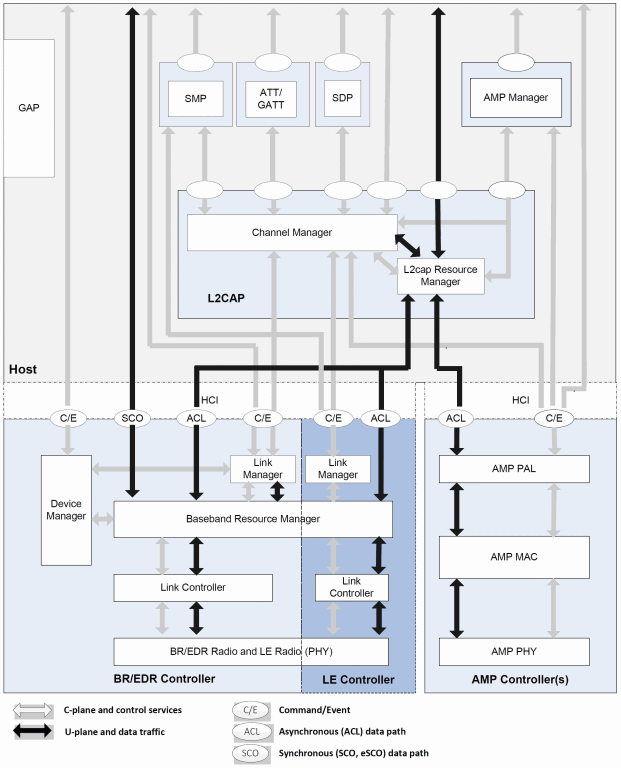 - 在一个系统中,Host只有一个,但Controller可以一个,也可以有多个。如:单独的LE Controller;单独的BR/EDR Controller;单独的LE+BR/EDR Controller;在单独的BR/EDR Controller或LE+BR/EDR Controller基础上,增加一个或多个额外的AMP Controller。
