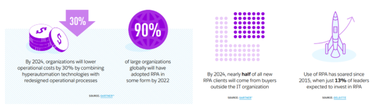 自动化的应用将成为推动现代数字化企业发展的核心动力,并非仅限于分散在单项项目中的应用场景。超自动化概念涉及通过流程重用以及整合多种先进技术(如低代码平台、机器学习算法和机器人流程 automation 技术),以提升企业的整体效率与生产力。研究机构预测,在企业加速探索如何快速识别并最大化可自动化的业务流程时,《某分析公司》指出相关市场规模预计将从 2018 年开始持续增长至 6,871 亿美元(复合年增长率超过 17%)。德勤咨询公司指出,在未来三年内有约 93%的企业决策者认为,在未来三年内 RPA 将成为主流应用工具。一项针对全球主要企业的调查显示:大多数组织已经或计划采用自动化的措施来实现战略目标——例如提高生产率(平均可达 96%)的同时优化运营效率(平均提升至 93%),并致力于改善客户体验质量(平均提升至 93%)。