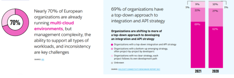 IT及业务领导层广泛认同,打造无缝数字体验能力是现代组织取得成功的关键要素。到2022年为止,通用API管理已成为各企业解决这一问题的主要关注点。云计算方案为企业提供了应对此前疫情带来的挑战的有效途径。然而这种转变也显著提升了现代数字生态系统的复杂度。当前,在97.4%的企业中普遍采用多云架构而在81.6%的企业中采用混合云架构成为主流选择。依据德勤(Deloitte)的研究显示几乎所有(97%)IT经理均计划通过将工作负载分散至两个或以上的云计算环境来实现最佳配置以增强系统弹性并满足监管需求。