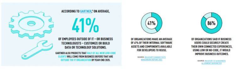 预测指出, 高德纳公司(Gartner)预计, 到2024年, 约有80%的技术产品和服务将由非技术专业人士制造, 这些产品和服务的成功主要依赖于低代码、无编码方法以及人工智能辅助开发工具的应用, 成为了实现目标的重要工具之一, 研究发现, 约有77%的企业认为这些自动化、集成、应用开发及数据科学与人工智能工具的应用非常关键, 大约有80%的企业认为如果数据与IT功能能够整合到打包业务功能中,则能够更快地创建解决方案并交付数字项目, 超过三分之一(36%)的企业认为拥有成熟的API集成技术能够让非IT用户提供便利地整合应用程序与数据源的能力
