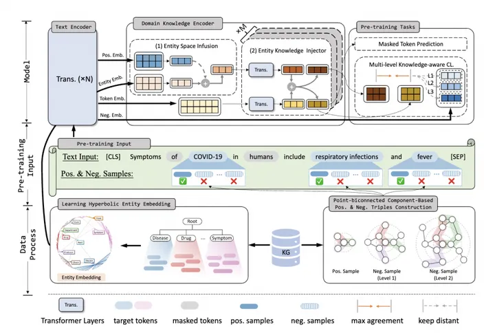该研究工作立足于上述领域知识图谱(Knowledge Graph, KG)的核心数据特征,并提出了一种高效统一的方法体系来处理垂直领域的知识表示问题(Knowledge Extraction and Learning Module, KEPLM)。具体而言,在知识提取阶段(Knowledge-aware Extractor),该方法采用双曲空间模型对垂直领域的图谱数据进行层次化语义分析,并以此为依据补充全局语义稀疏模块(Hyperbolic Knowledge-aware Aggregator);在知识表示阶段(Knowledge Representation Module),通过构建基于点双连通分量的知识增强模块(Multi-Level Knowledge-aware Augmenter),有效捕捉领域图谱中的密集子图结构特征。