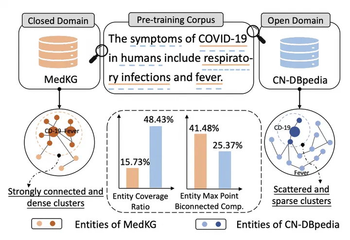 知识增强预训练语言模型(KEPLM)能够通过整合大规模知识图谱中的实体与关系信息来显著提升多种下游自然语言处理任务的表现能力。然而,在垂直特定领域的迁移过程中仍面临诸多挑战:尽管现有的开放域KEPLM方法能够在一定程度上模仿垂直领域知识图谱的特点以实现迁移学习效果提升,在实际应用中发现这些方法往往难以满足特定领域的个性化需求。如图所示,在垂直领域中与纯文本相比的知识图谱实体覆盖率为较低水平;这种现象表明传统方法仅依赖于少量关键三元组进行知识融入的方式可能无法充分满足特定领域的语义建模需求。进一步研究表明:相较于开放域场景下较为分散的知识分布特征而言,在垂直特定领域的知识图谱呈现出高度集中的双连通分量占比显著更高;这表明在垂直特定领域内同一实体类下的实体间具有较强的关联性并展现出明显的局部密集分布特征。