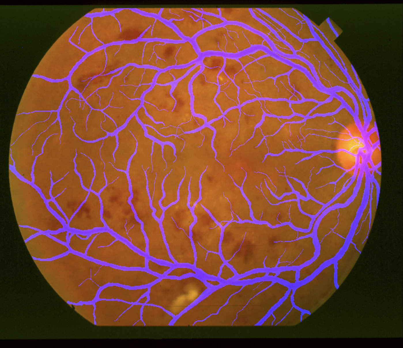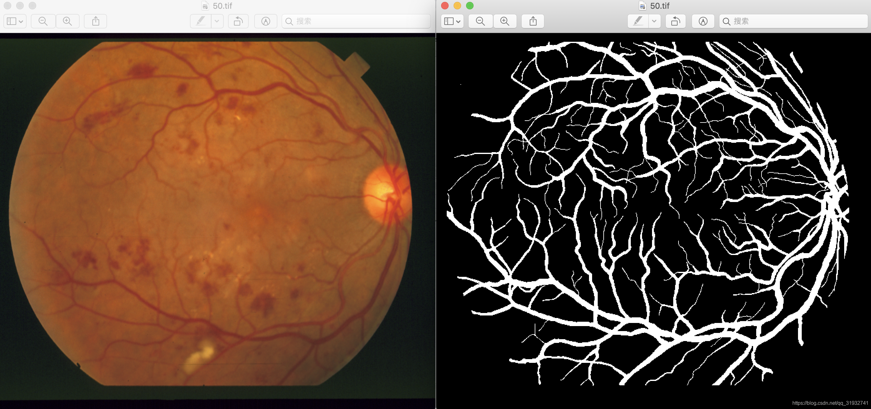 那么提取的血管总不能是灰色的吧,所以最后预测得到的(512,512)区间(0,1)的结果,乘回去原图就可以获得到血管了