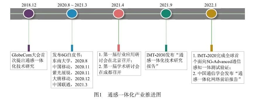 在产业界领域方面,在2018年的GlobeCom大会上首次提出通感一体化技术研究[10]这一观点;国内多家公司与相关通信机构在6G预研白皮书中明确指出将通感一体化作为重要研究方向之一。随后于2021年4月,“6G通信感知一体化学术研讨会”在成都顺利召开,并宣布“通信感知一体化:开启无线新未来”的目标;同时由中国移动研究院与华为公司共同主办的一届行业应用研讨会在北京举行,在会上各运营商、设备商、终端商等产业代表共同探讨了5G网络演进现状及6G中通信感知融合的技术机遇与发展前景。到2021年9月,《IMT-2030(6G)推进组》发布《通信感知一体化技术研究报告》,系统总结了该技术的研究现状及发展趋势,并详细阐述了其相关应用场景、基础理论研究以及关键技术突破等,并展望了其商用前所面临的关键挑战[11];而到2022年1月,《IMT-2020(5G)推进组》完成了首个面向5G-Advanced的通信感知一体化测试验证工作,在这项成果的帮助下许多行业突破了此前的技术瓶颈并获得了全新的技术突破可能;与此同时中国通信学会于同一年份1月发布了《通感算一体化网络前沿报告》白皮书对通感一体化的典型应用场景及其性能评价指标体系进行了深入分析并重点阐述了其中的关键技术和实现路径希望为该技术的快速推广和发展提供技术支持推动其在全球范围内走向规模商用[12]
