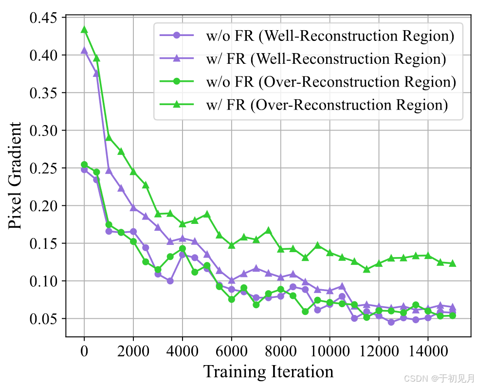 After terminating at the 15,000th iteration, which mirrors the approach in 3DGS, we present comparisons prior to reaching this threshold. It becomes evident that frequency regularization significantly increases pixel gradient magnitudes within over-reconstruction regions. Therefore, when contrasted with L¹ loss, frequency regularization demonstrates superior capability in identifying these over-reconstructed areas.