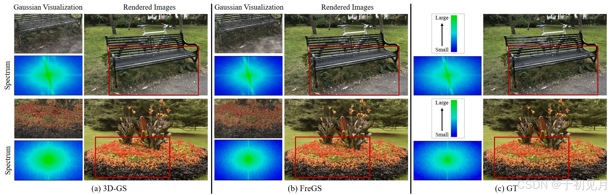 The Gaussian Visualization displays the composition of images through learned 3D Gaussians (where all Gaussians are rendered with full opacity). The Spectra are created using image Fourier transformation, resulting in a color transition from blue to green as the spectrum amplitude varies from low to high.