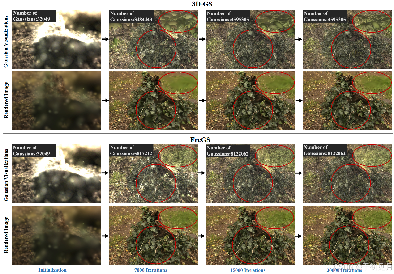 Notice that the proposed method of progressive frequency regularization enables more precise Gaussian densification and produces more advanced novel view synthesis.