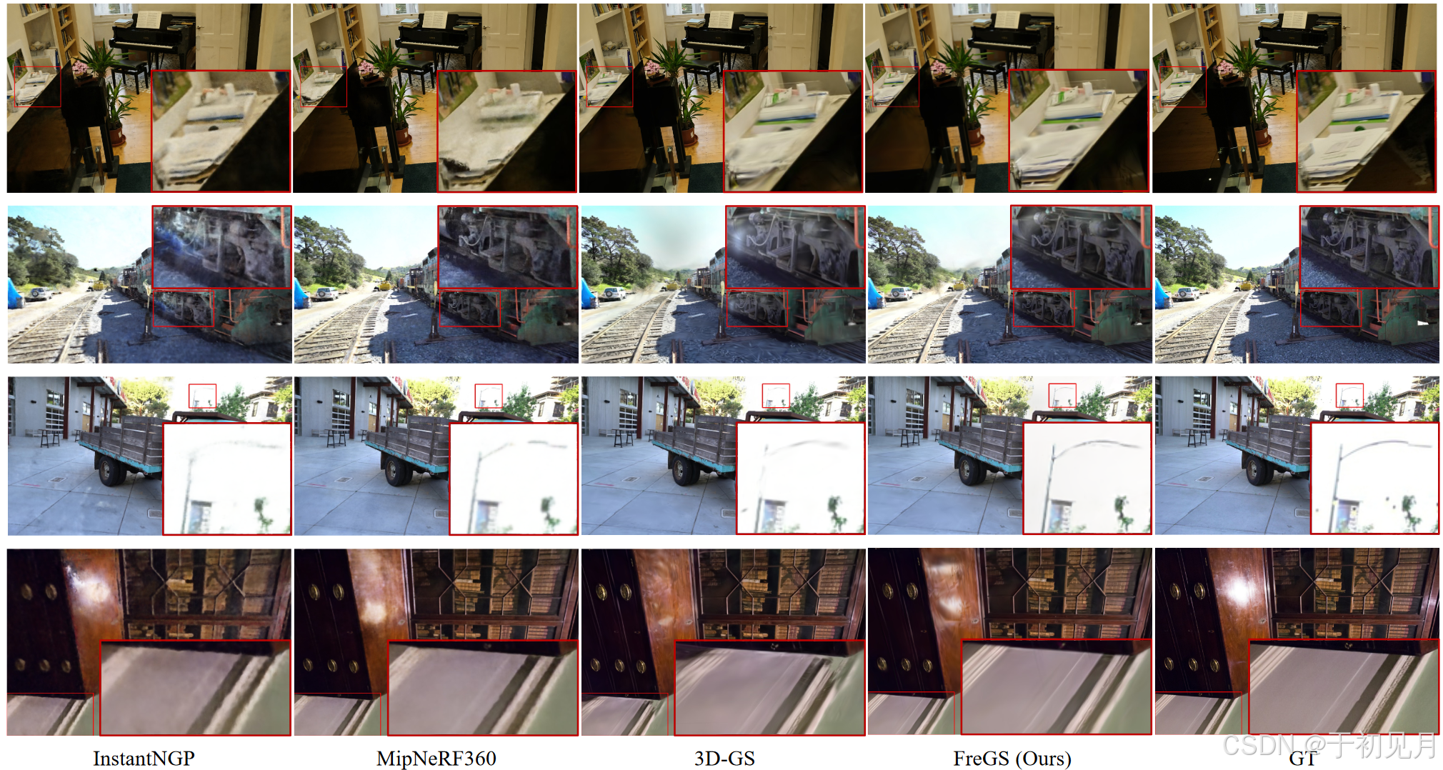 ‘GT’ represents the ground-truth images. The proposed method FreGS offers high-quality image rendering, featuring fewer artifacts and a greater level of detail.