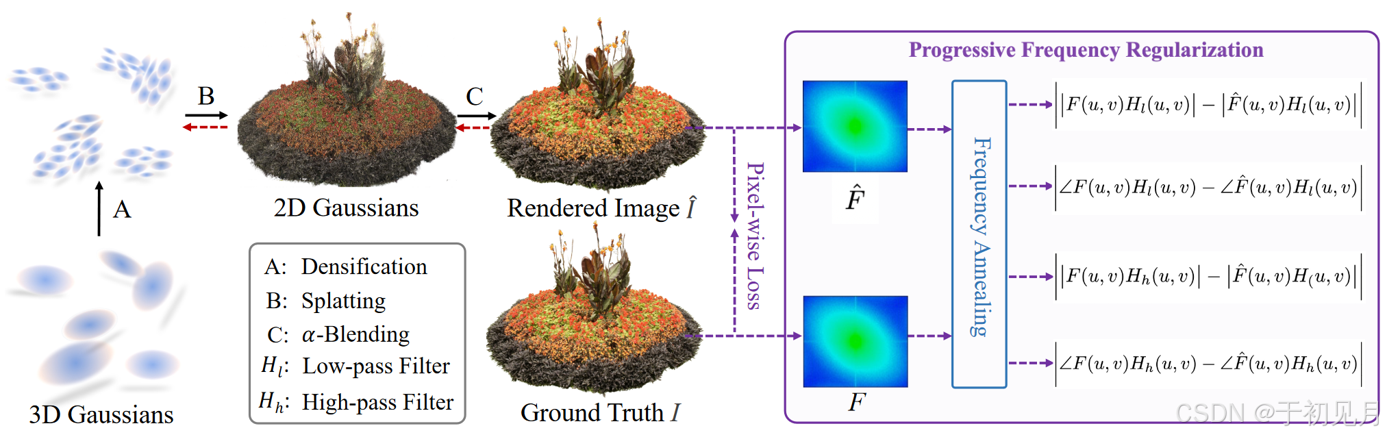 Specifically, we develop afrequency annealing technique for progressive frequency regularization, which achieves gradual Gaussian densification from coarse to fine through the progressive utilization of low-frequency to high-frequency components, all of which are extractable using **low-pass and high-pass filters within the Fourier domain.