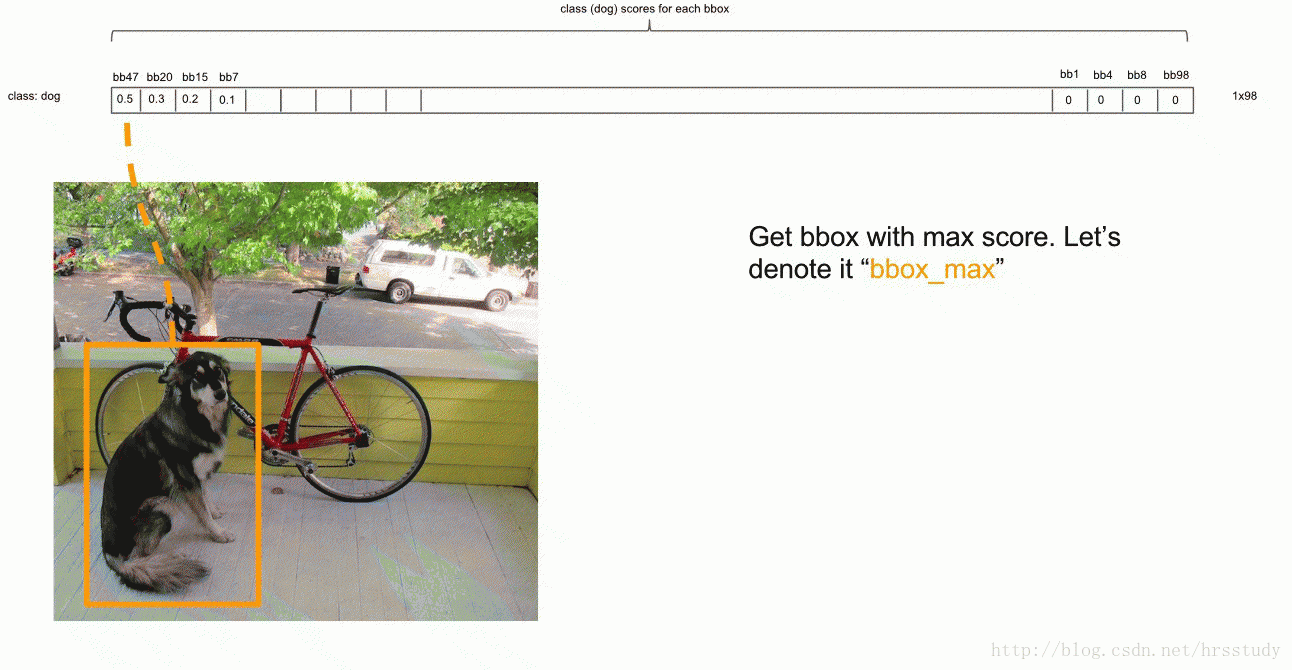 (1)对于上述的98列数据,先看某一个类别,也就是只看98列的这一行所有数据,先拿出最大值概率的那个框,剩下的每一个都与它做比较,如果两者的IoU大于某个阈值,则认为这俩框重复识别了同一个物体,就将其中低概率的重置成0。