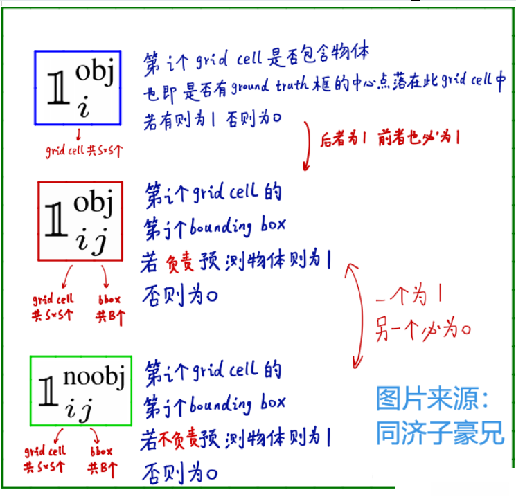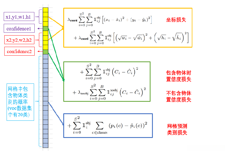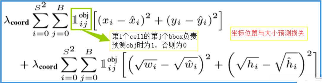 - 第一行: 负责检测物体的那个框的置信度误差。