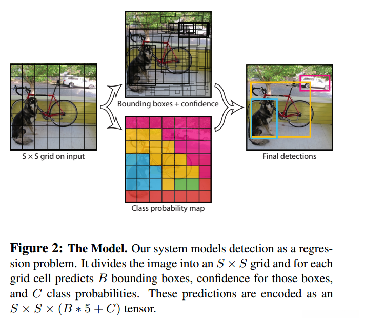 综上,S×S 个网格,每个网格要预测 B个bounding box (中间上图),还要预测 C 个类(中间下图)。 将两图合并,网络输出就是一个 S × S × (5×B+C)。(S x S个网格,每个网格都有B个预测框,每个框又有5个参数,再加上每个网格都有C个预测类)。