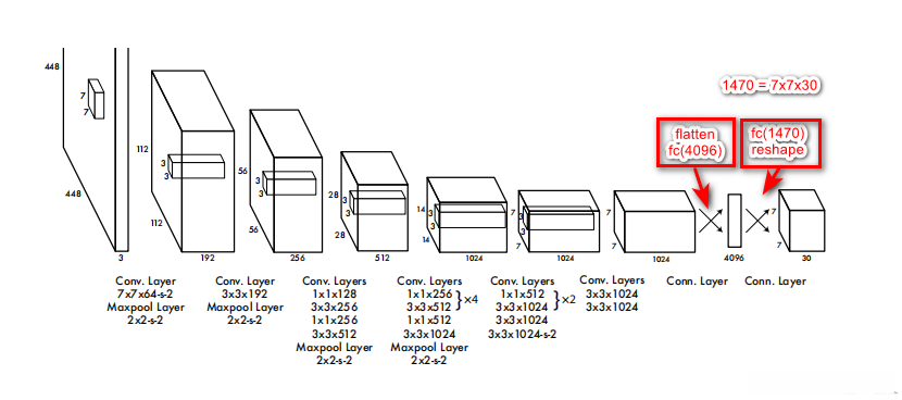 7×7×30: 总共是7 × 7个gird cell一共就是7 × 7 ×(2 × 5+ 20)= 7 × 7 × 30 tensor = 1470 outputs,正好对应论文。