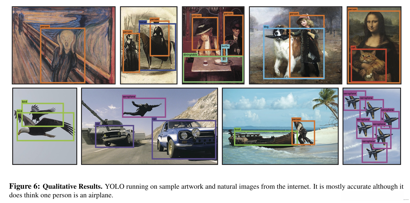 (3)YOLO 学到物体更泛化的特征表示。因此当应用于新域或意外输入时,不太可能崩溃。