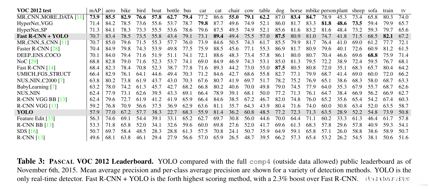 结论: 因为YOLO在测试时犯了各种错误,所以它在提高快速R-CNN的性能方面非常有效。但是这种组合并不受益于YOLO的速度,由于YOLO很快,和Fast R-CNN相比,它不增加任何有意义的计算时间。