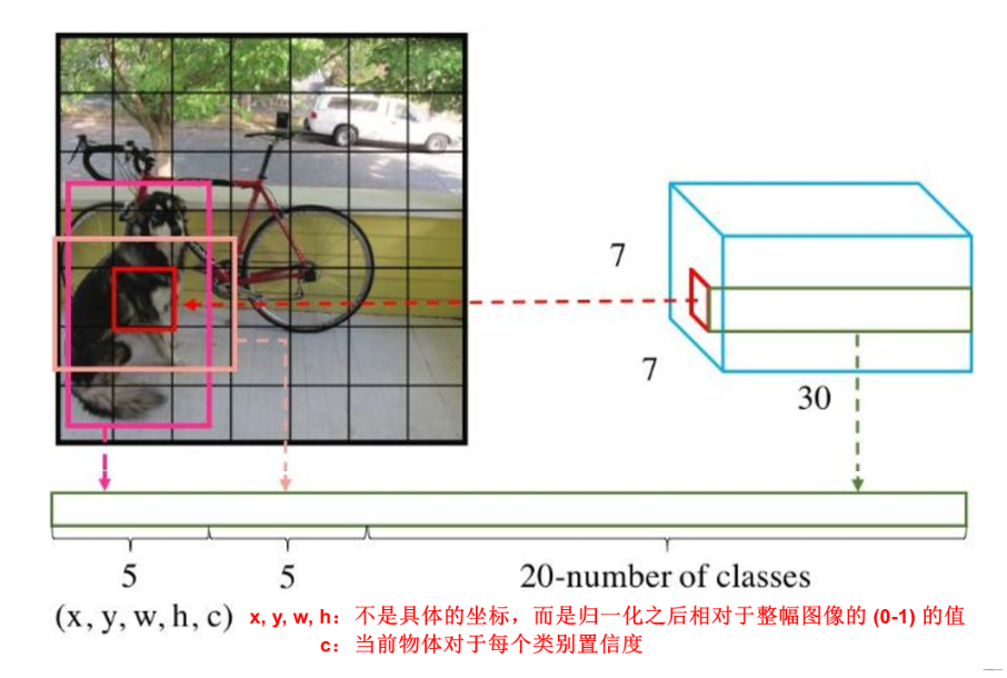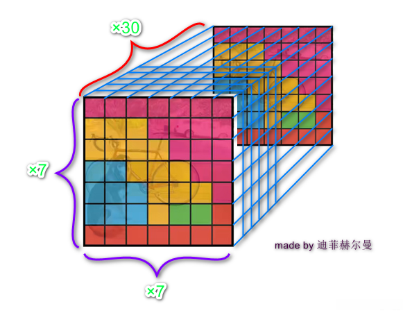 30: 30包含了两个预测框的参数和Pascal VOC的类别参数:每个预测框有5个参数:x,y,w,h,confidence。另外,Pascal VOC里面还有20个类别;所以最后的30实际上是由5x2+20组成的,也就是说这一个30维的向量就是一个gird cell的信息。