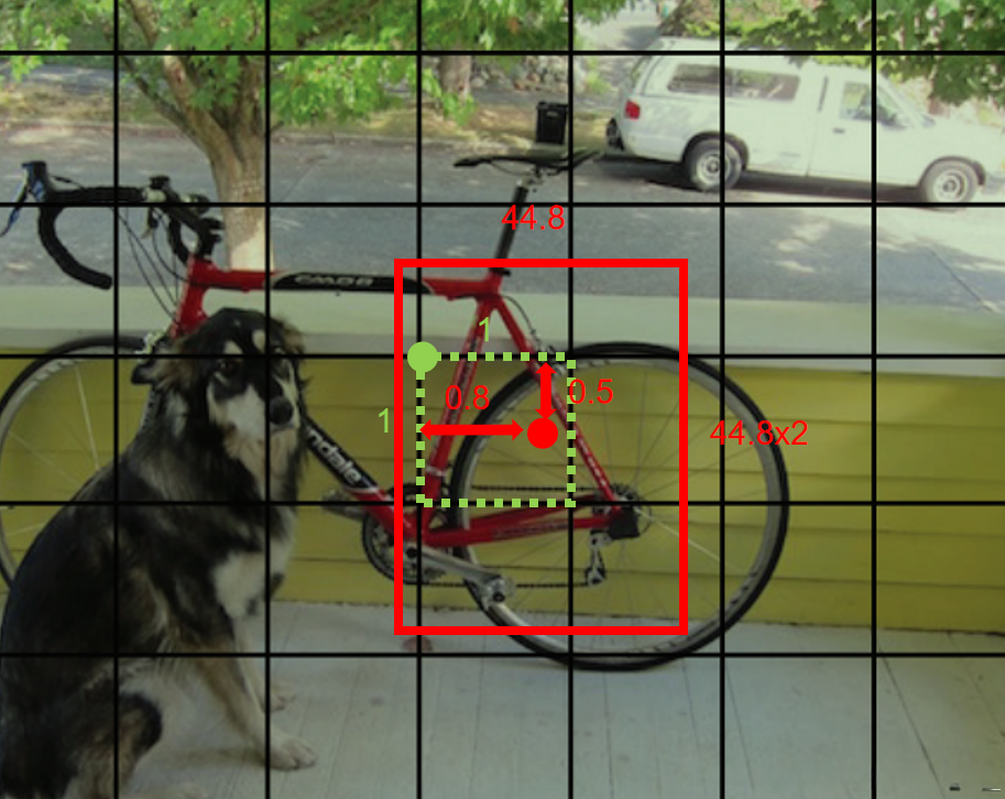 在上图中,绿色虚线框代表grid cell,绿点表示该grid cell的左上角坐标,为(0,0);红色和蓝色框代表该grid cell包含的两个bounding box,红点和蓝点表示这两个bounding box的中心坐标。有一点很重要,bounding box的中心坐标一定在该grid cell内部,因此,红点和蓝点的坐标可以归一化在0-1之间。在上图中,红点的坐标为(0.5,0.5),即x=y=0.5,蓝点的坐标为(0.9,0.9),即x=y=0.9。