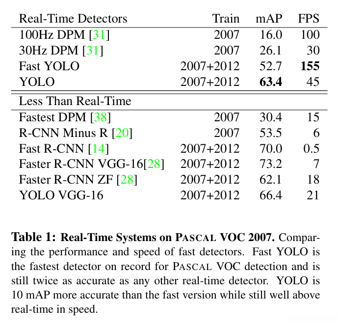 Table 1 在Pascal VOC 2007 上与其它检测方法的对比