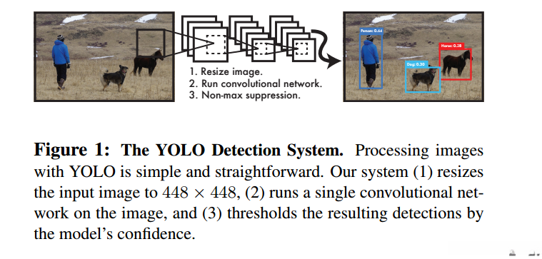 如 Figure 1:将图像输入单独的一个 CNN 网络,就会预测出 bounding box,以及这些 bounding box 所属类别的概率。YOLO 用一整幅图像来训练,同时可以直接优化性能检测。