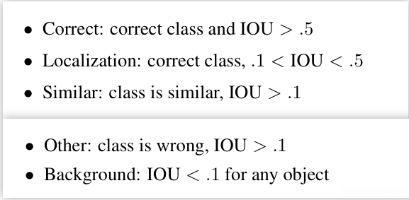 Similar: 预测了相近的类别,且预测框与ground truth的IOU大于0.1。即预测的类别虽不正确但相近,预测框的位置还可以接受。