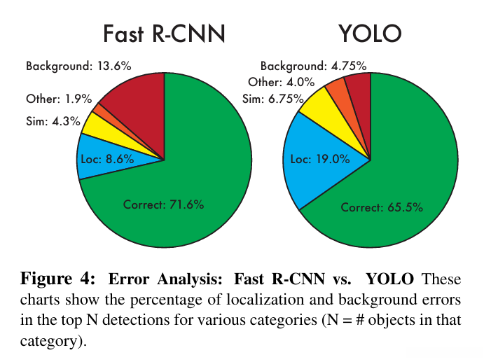 结论: YOLO定位错误率高于Fast R-CNN;Fast R-CNN背景预测错误率高于YOLO 。